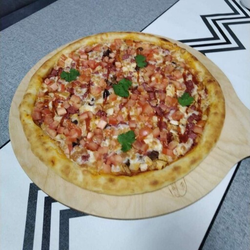Соус итальянский, курица копченая, колбаса Халяль, говядина маринованная, сыр моцарелла, 600 гр