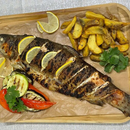 Форель приготовленный на мангале с овощами, подается с гарниром