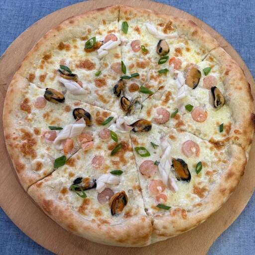 Сливочный соус, Мясо мидии, Салатный креветка, Кальмар, Лосось, Сыр моцарелла, Зеленый лук, 570 гр