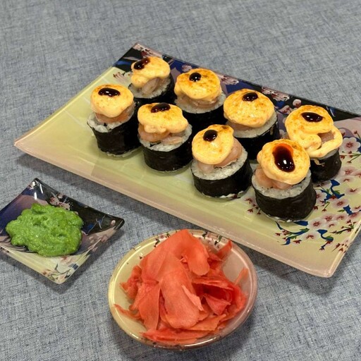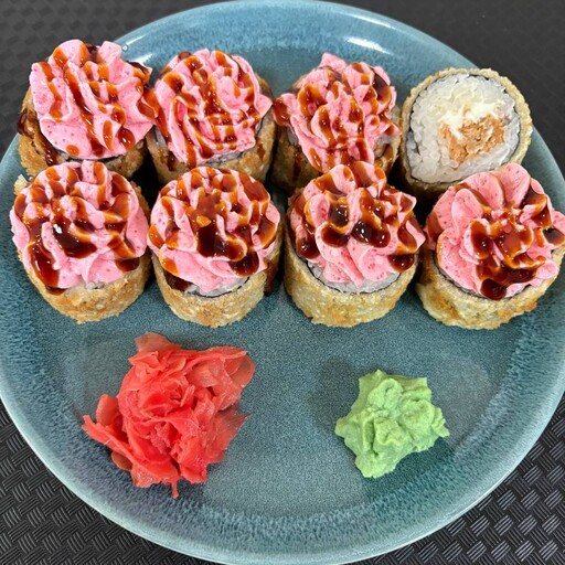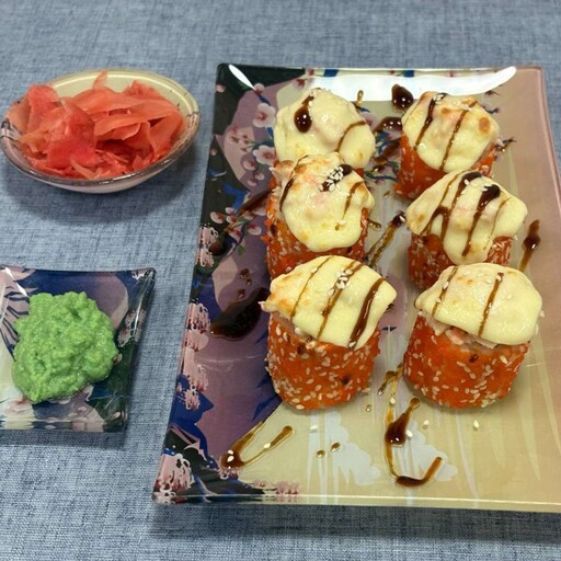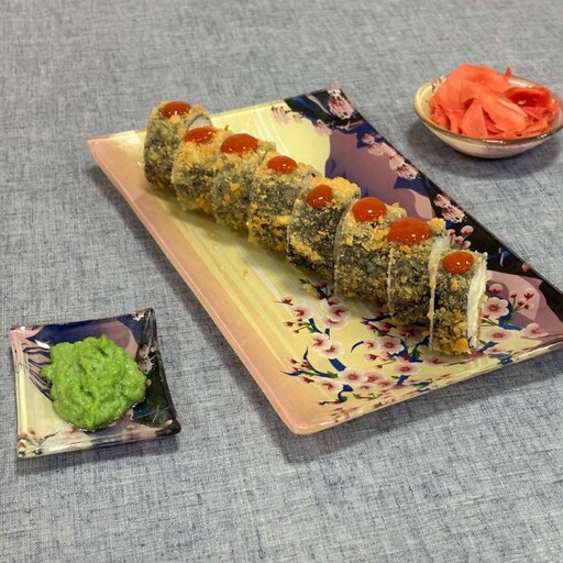 Жареный лосось, творожный сыр, рис, кляр, панко, лава соус, унаги соус, нори
