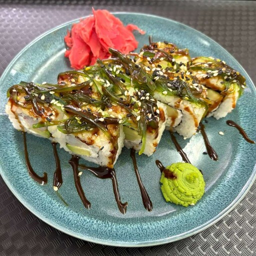 нори, рис, королевская креветка, сыр творожный, авокадо , чука, соус унаги, кунжут микс