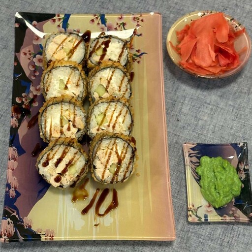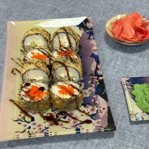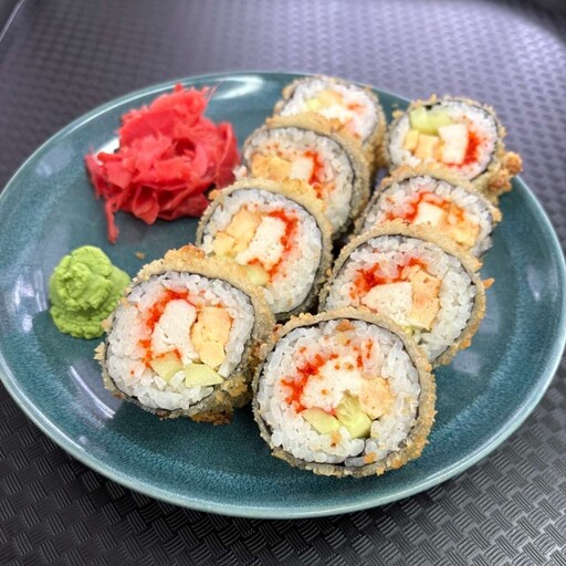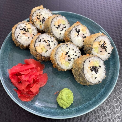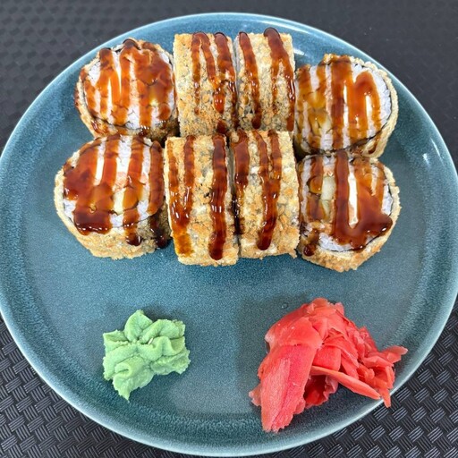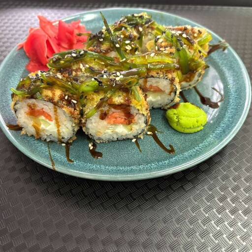 Жареный лосось, творожный сыр, рис, огурец, кляр, панко, соус унаги, нори