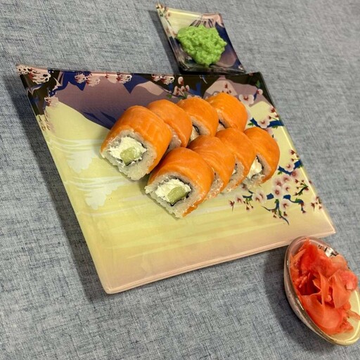 Лосось холодного копчения, сливочный сыр, огурец, нори, зеленый лук, рис