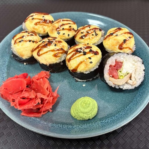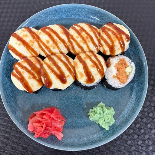 Лосось, рис, сливочный сыр, соус табаска, омлет, нори