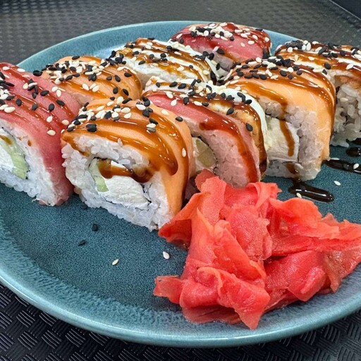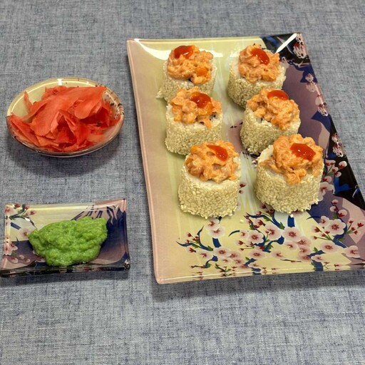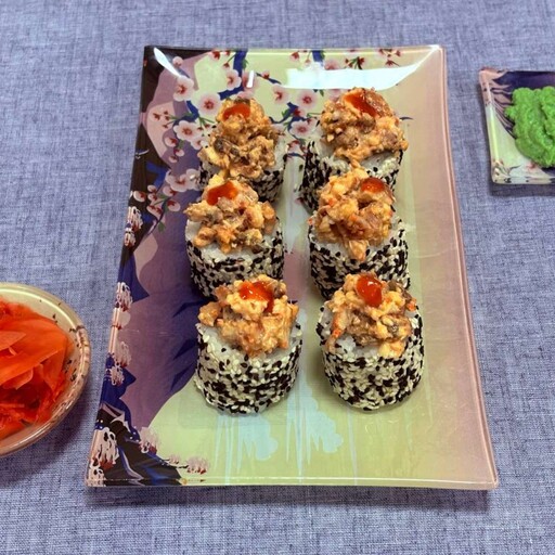 нори, рис, сыр творожный, маринованный тунец, лук зеленый, соус спайси, соус унаги, кунжут микс,
