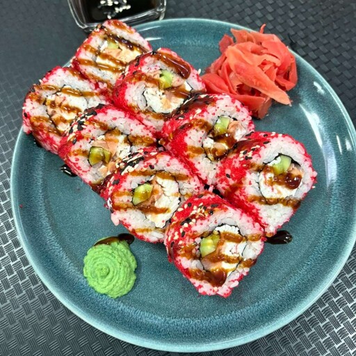 Королевская креветка, рис, огурец, лава соус, унаги соус, нори