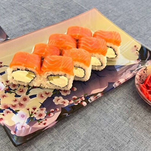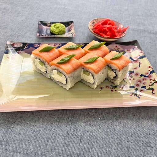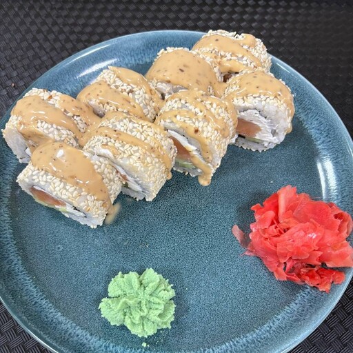 Жареный лосось, творожный сыр, рис, огурец, соус монако, соус унаги, нори