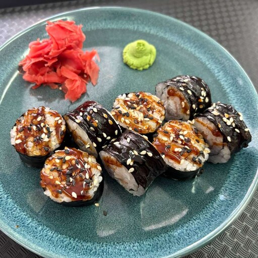 рис, нори, унаги соус, угорь, кунжут микс