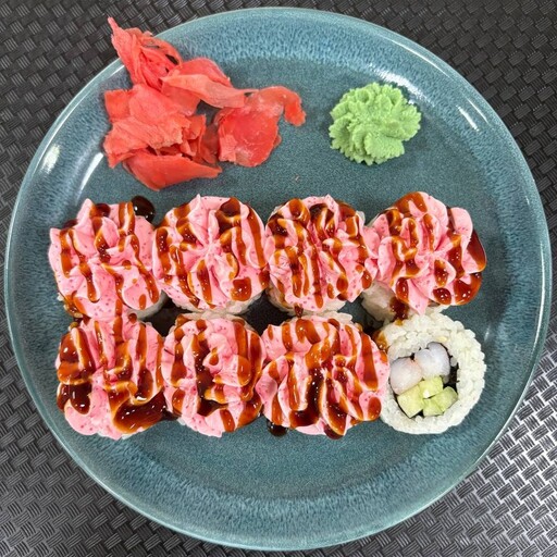Креветка, рис, огурец, авокадо, сыр, омлет, розовый соус, нори