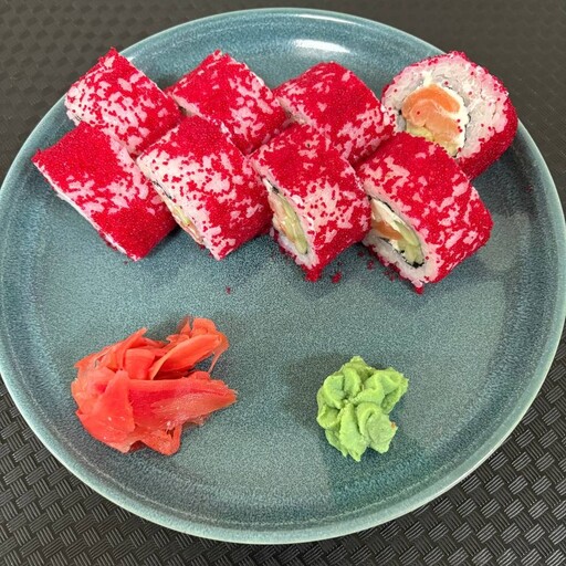 Лосось, творожный сыр, рис, огурец, икра красная, нори