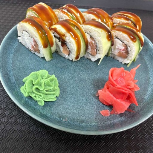 Лосось, рис, огурец, лава соус, унаги соус, нори
