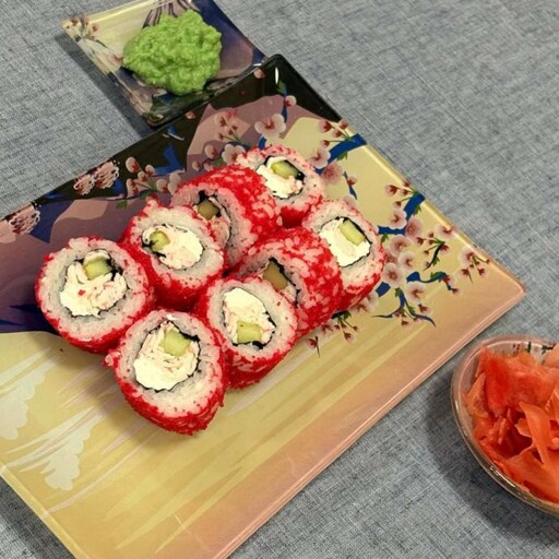 Рис, сливочный сыр, краб, авокадо, оранжевая икра масаго, нори