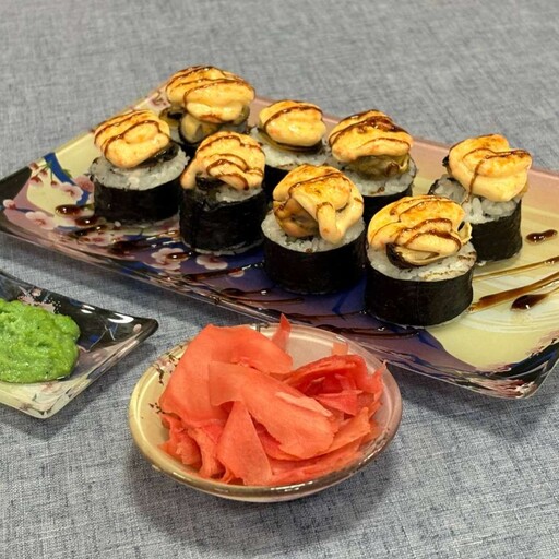 Мидии, рис, омлет, сыр, огурец, розовый соус, унаги соус