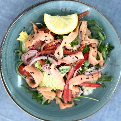 лосось холодного копчения, салат микс, перец красный, лук красный, черри, соус горчичный