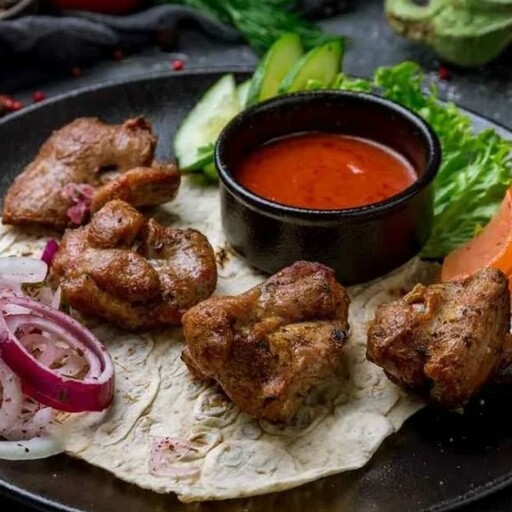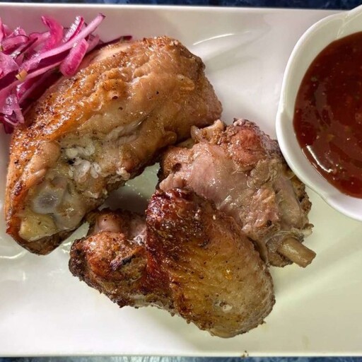 Используются куриное бедро, голень, крылышки Подается маринованным луком и соусом. в порции 350г