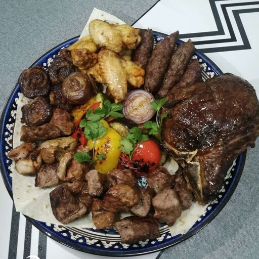 Стейк, люля кебаб из говядины, люля кебаб из баранины, куриный шашлык, шашлык из мякоти баранины, шашлык из мякоти говядины, овощи на гриле, лаваш, 1,5 кг