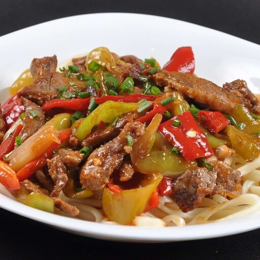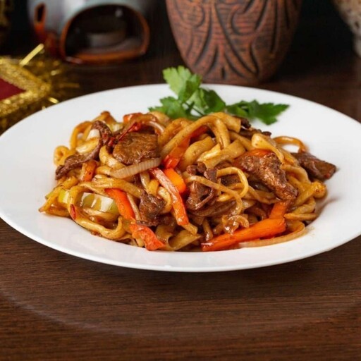 С жаренной домашней лапшой и говядина с овощами В порции 300 гр